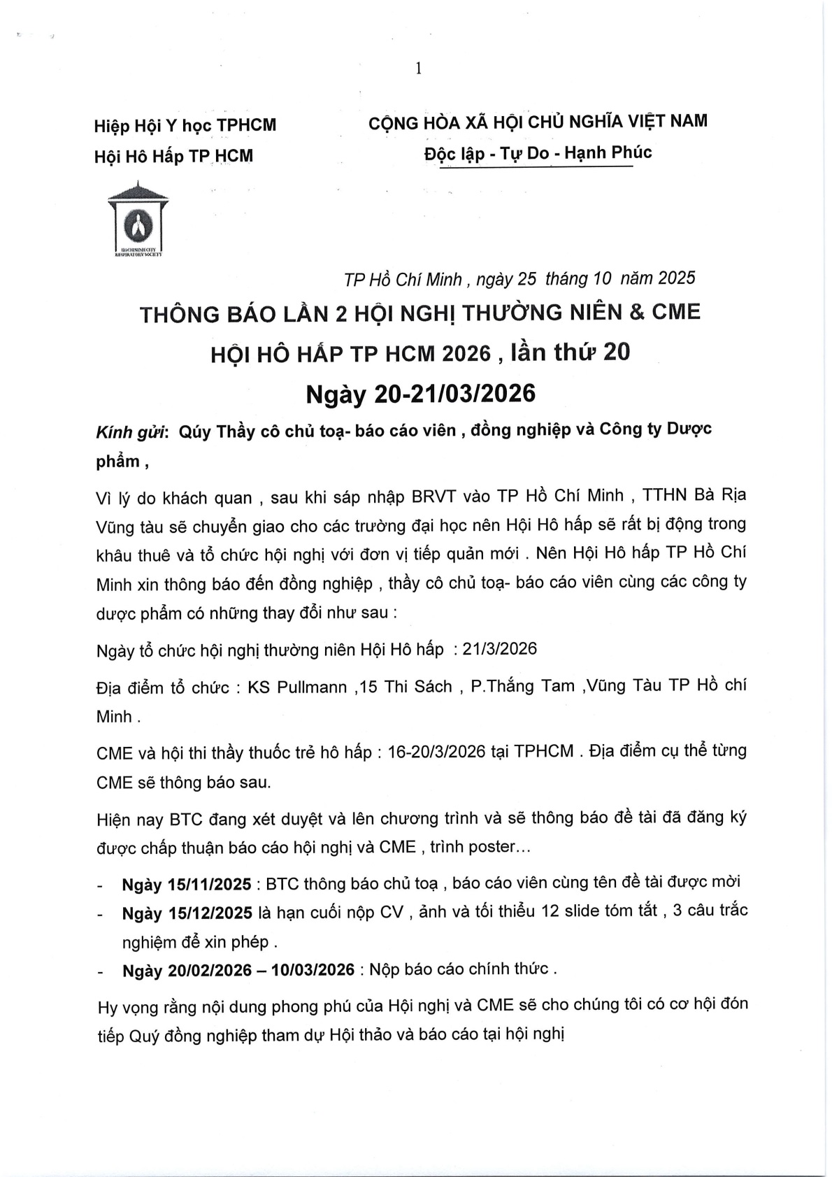 Thông báo lần 1 Hội nghị thường niên Hội Hô Hấp TP.HCM và CME 2026 - ngày 27-28/03/026